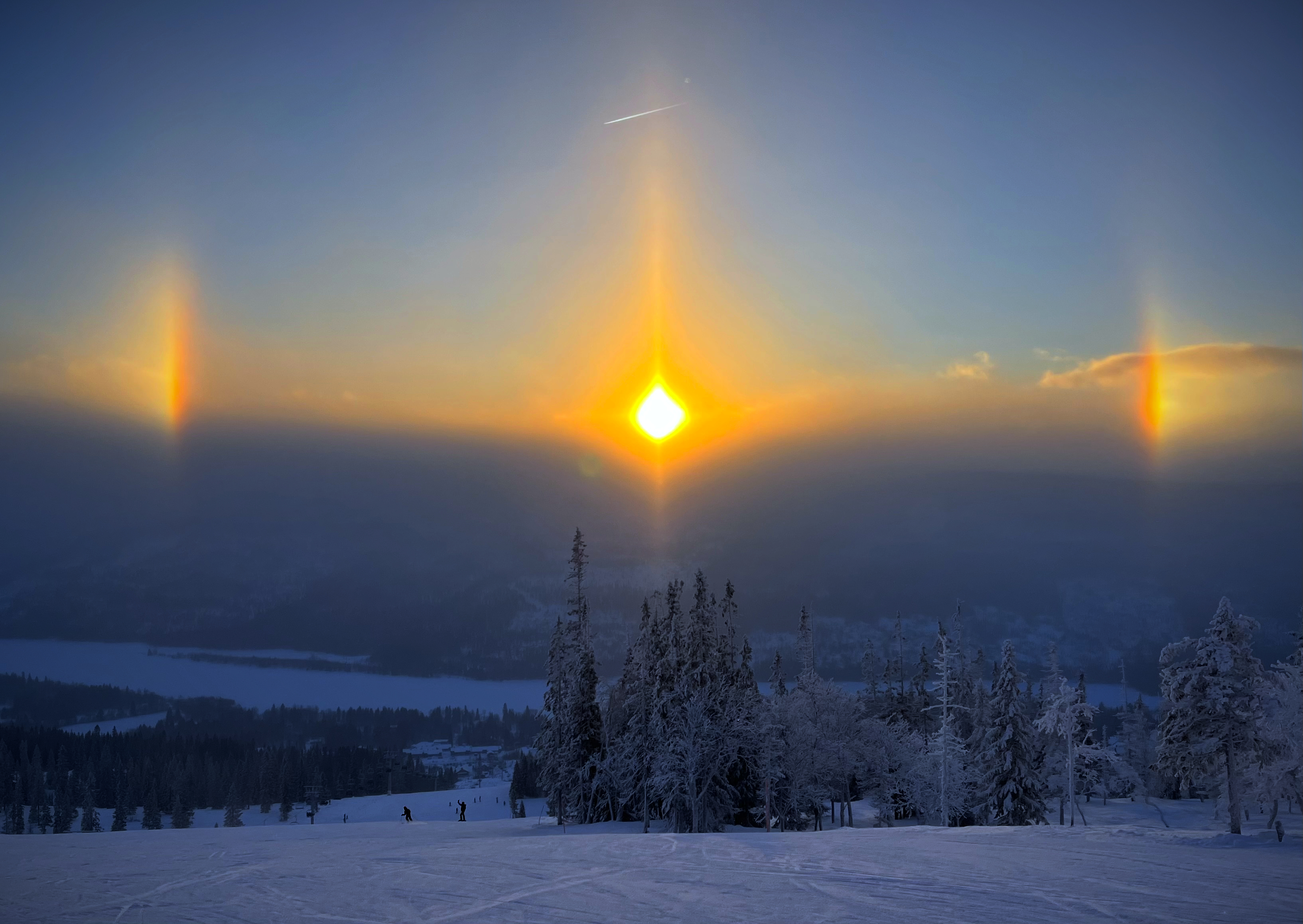 Description: A sundog halo during the sunset enclosing a falling star, just above a slope.